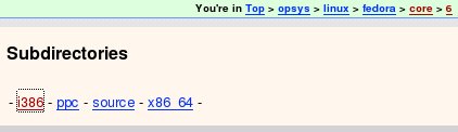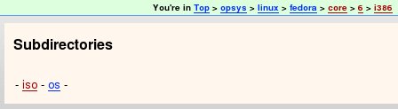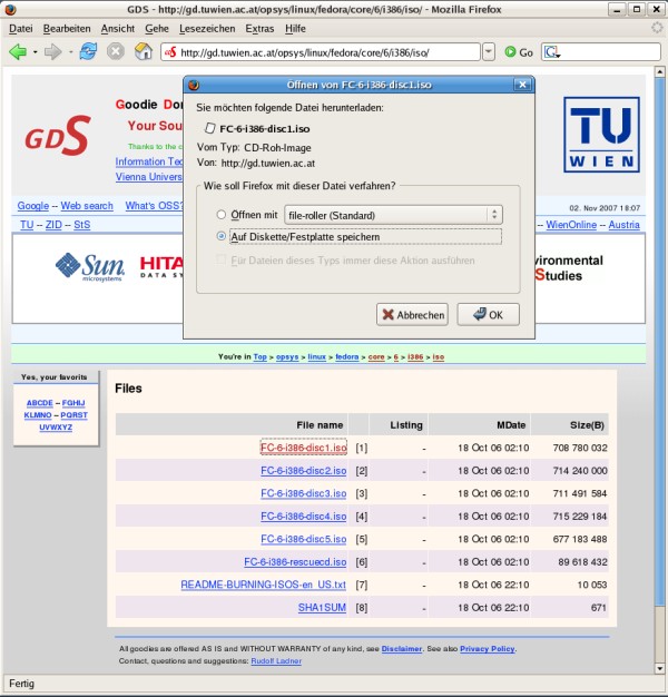 Für dieses Beispiel wurde 'http' als Übertragungsprotokoll ausgewählt. Die Ansicht der gezeigten Web-Seite hängt davon ab, wie der Betrieber des Spiegel-Servers die Web-Seite gestaltet. Ich nehme aber an, daß die Web-Seite bei jedem Betreiber so klar gestaltet ist, daß die Images zum Herunterladen leicht gefunden werden. In diesem Beispiel wurde die Web-Seite der TU Wien gewählt. Durch Anklicken der Fedora Version ('6'), anschließend der Prozessor-Architektur ('i386') und zuletzt der Art des Images ('iso') werden die Images für die Installation-DVD oder die Installations-CDs angezeigt (Abbildung im nächsten Absatz). |