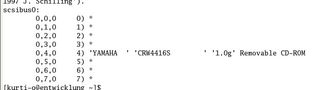wird das Kommando Als Ergebnis werden alle Hardware-Adressen und auch die angeschlossenen Geräte ausgegeben. Im Beispiel ist der CD-Brenner am Anschluß mit der Adresse '0,4,0' angeschlossen. Diese Information wird für das Kommando zum Brennen – wie im nächsten Absatz beschrieben – gebraucht. |