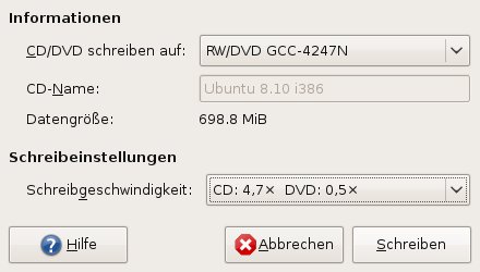 wird das Programm zum Schreiben der CD aufgerufen. Empfehlenswert ist, für die 'Schreibgeschwindigkeit' den niedersten Wert auszuwählen – dadurch wird verhindert, dass der Brennvorgang möglicherweise unterbrochen und die erstellte CD unbrauchbar wird. Das Erstellen der CD wird durch das Anklicken der Schaltfläche [ Schreiben ] gestartet.
