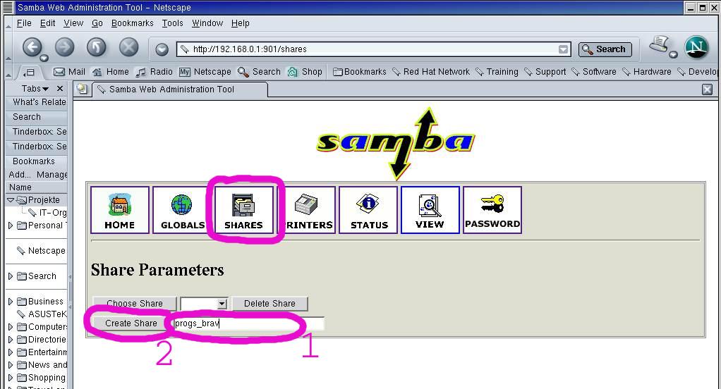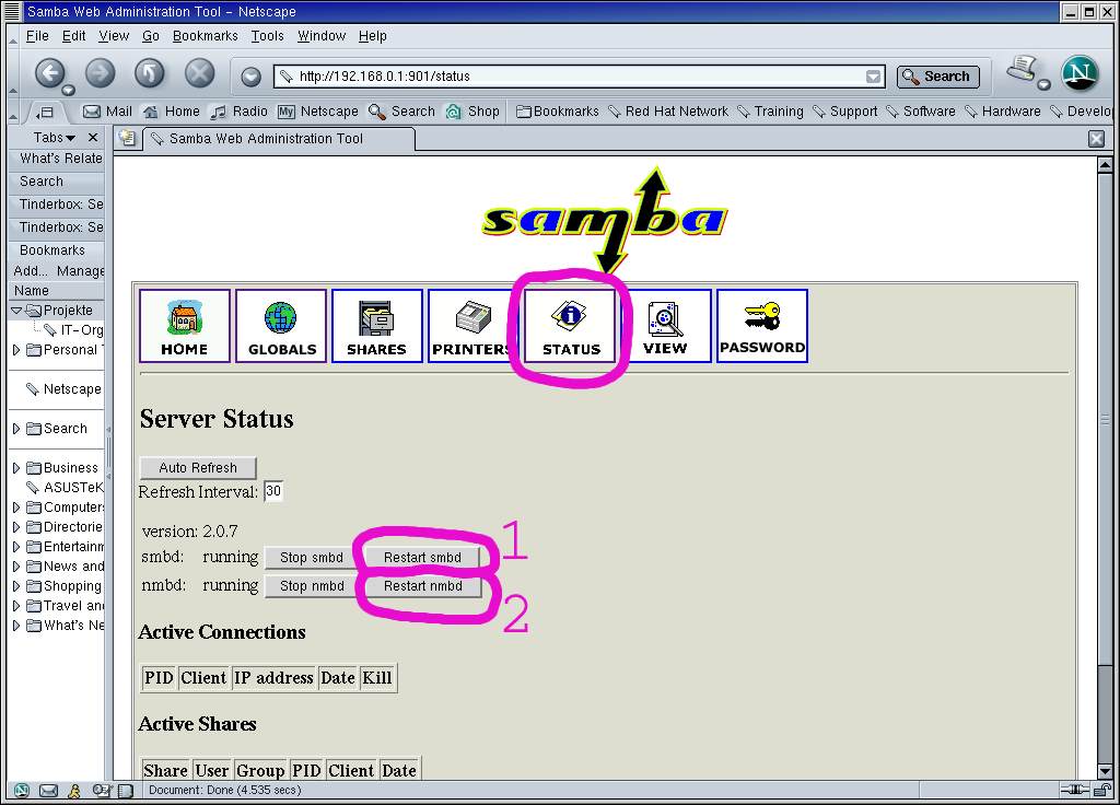on the displayed page clicking the buttons 'Restart smbd' (1) and 'Restart nmbd' (2).