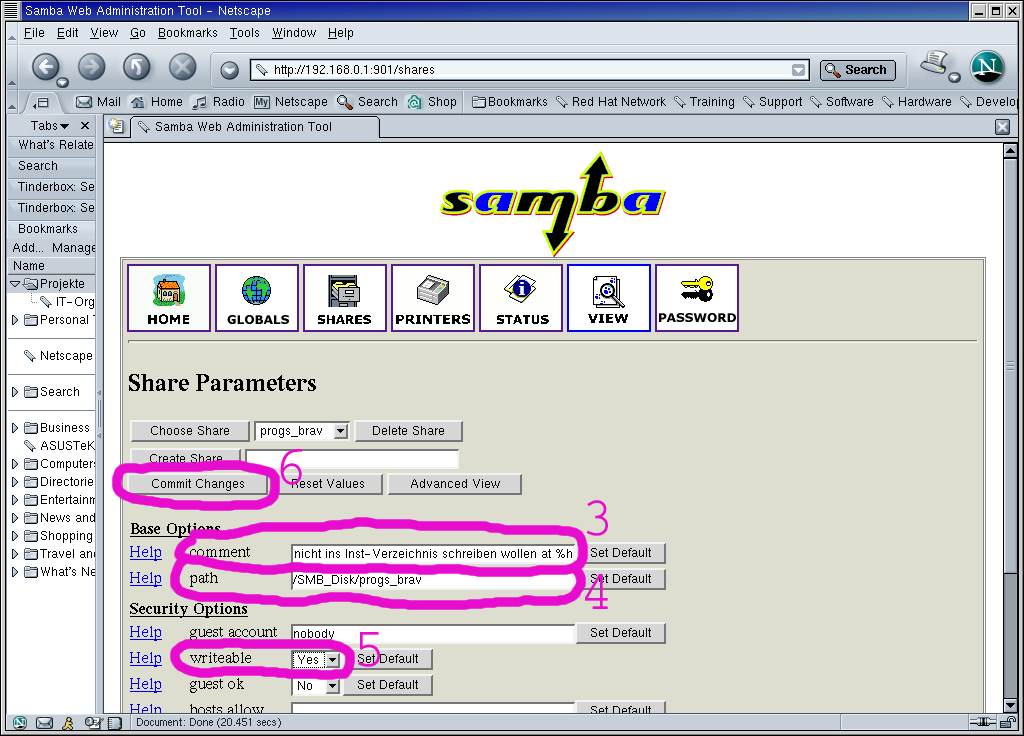 All other settings are left unchanged and the change is committed with 'Commit Changes' (6).