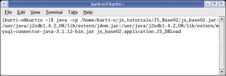 command: java -cp /home/kurti-o/js_tutorials//JS_Base02/js_base02.jar:/usr/java/j2sdk1.4.2_08/lib/extern/jdom.jar:/use/java/j2sdk1.4.2_08/lib/extern/mysql-connector-java-3.1.12-bin.jar