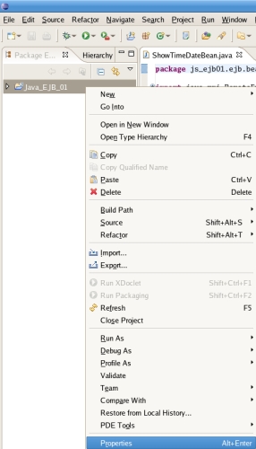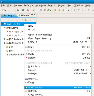 Das Ausführen des XDoclet-Generators wird durch Anklicken des 'Project's mit der rechten Maustaste und dann Auswählen von Run XDoclet gestartet. |