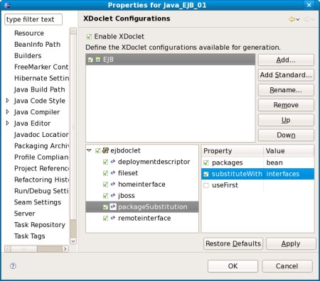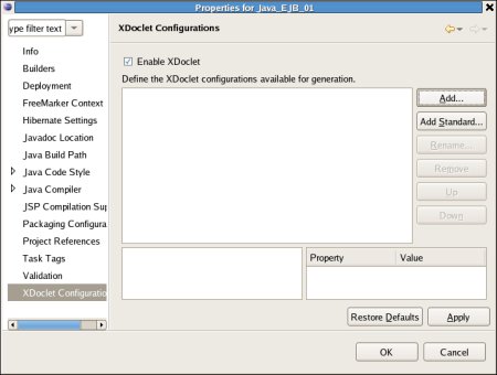 Im darauf hin erscheinenden Fenster (Properties für Java_EJB_01) wird in der linken Spalte 'XDoclet Configuration' ausgewählt. Um