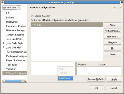 Konfiguration des XDoclet ist in den 'Properties' des jeweiligen