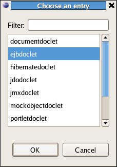 vorbereiteten Prozeduren für verschiedenste Aufgaben. Deswegen wird im angezeigten Fenster (Choose an entry) 'ejbdoclet' ausgewählt. Durch Klicken der Schaltfläche [ OK ] wird die Auswahl gültig und das Fenster geschlossen. |