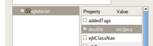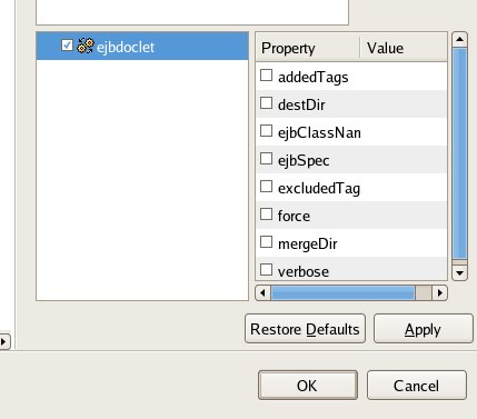 Bildschirmhöhe zu vergrößern. Weil derzeit nur eine Art von XDoclet-Konfiguration 'ejbdoclet' vorhanden ist, werden nur dessen 'Properties' im Bereich rechts unten angezeigt. Wären mehrere XDoclet-Konfigurationen vorhanden, würden die entsprechenden 'Properties' angezeigt wenn eine XDoclet-Konfiguration ausgewählt wird. |