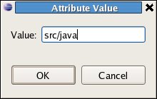 Durch einen Doppelklick mit der linken Maustaste auf die Zeile 'destDir' öffnet sich ein Fenster für die Eingabe des Wertes. Der Wert (src/java als Standardwert für alle EJB die entsprechend dieses Dokumentation erstellt werden) wird im Feld 'Value' eingegeben und das Fenster durck Anklicken der Schaltfläche [ OK ] wieder geschlossen. Im rechten unteren Bereich ist anschließend der erfaßte Wert (src/java) für die Property ('destDir') zu sehen. Erklärung