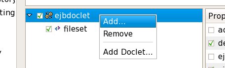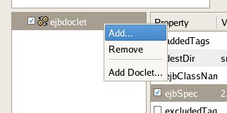 Wählen Sie im unteren Bereich 'ejbdoclet' aus und Klicken Sie mit der rechten Maustaste darauf. Im anschließend erscheinenden Kontext-Menu wählen Sie 'Add...'. |