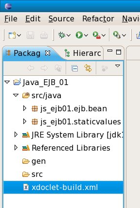 XDoclet ist ein Kunstwort für das Verfahren, aus Kommandos in Steuerdateien und in den Kommentaren (im Code der Java-Klassen der EJBs) eingebetteten Anweisungen weitere Dateien zu generieren: