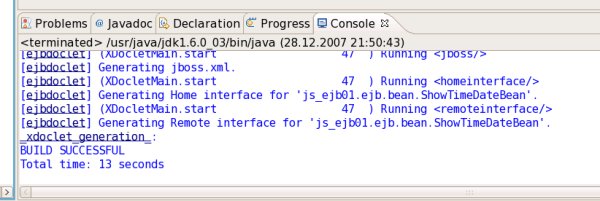 Abhängig von der Leistung des Computers braucht der XDoclet-Generator einige Sekunden für seine Arbeit. Der Fortschritt und der Abschluß der Generierung kann im 'Console' Bereich von Eclipse verfolgt werden. |