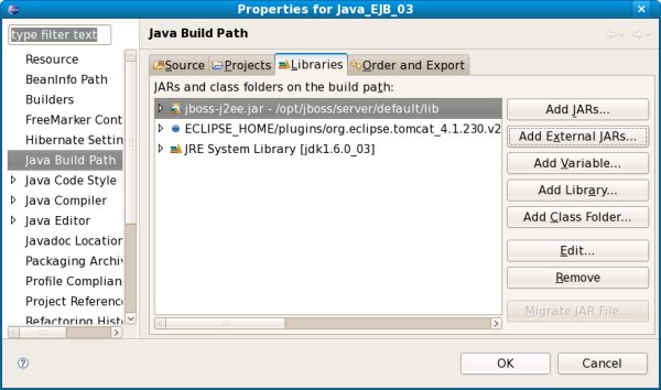 Detaillierte Anleitungen inklusive Abbildungen der Fenster finden Sie im Dokument Einfache Session Bean (Java_EJB_01) – Einrichten des Projects>Einbindung der Libraries (Programm-Bibliotheken in den Java Build Path . |