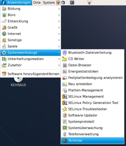 Öffnen Sie ein 'Terminal'-Fenster durch Auswahl von Anwendungen > Systemwerkzeuge > Terminal. |