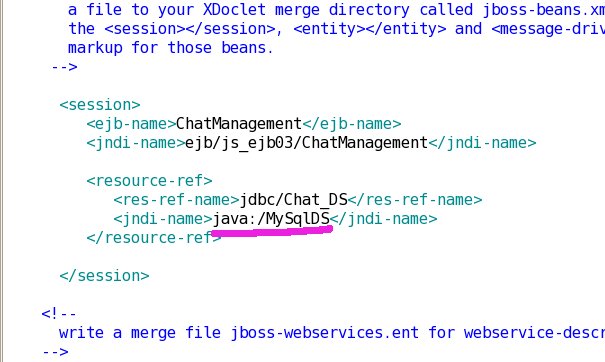 Eine Muster-Datei für eine MySQL-'Datasource' wird bei der Installation von JBoss unter dem Verzeichnis-/Datei-Namen '/opt/jboss/docs/examples/jca/mysql-ds.xml' installiert.