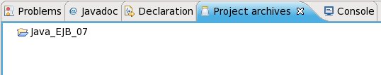 Um die JAR-Datei mit den definierten Inhaltsdateien zu erstellen wird die Datei 'Java_EJB_05-client.jar' mit der rechten Maustaste angeklickt und aus dem Kontext-Menu Build Archive (Full) ausgewählt. Der Vorgang des 'Packens' dauert nur Bruchteile einer Sekunde und es wird keine Rückmeldung gegeben wenn der Vorgang beendet ist. Die Methode wie geprüft werden kann, ob die Datei wie gewünscht erstellt wurde, ist unter JAR-Datei neu erstellen beschrieben. |