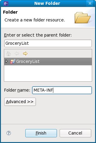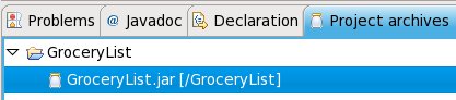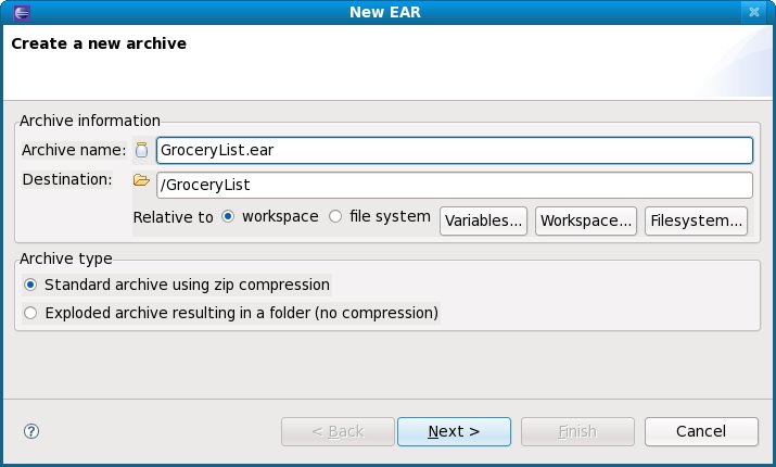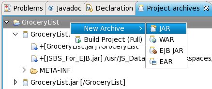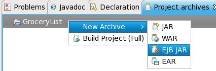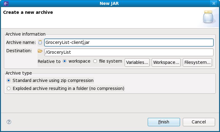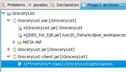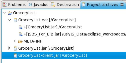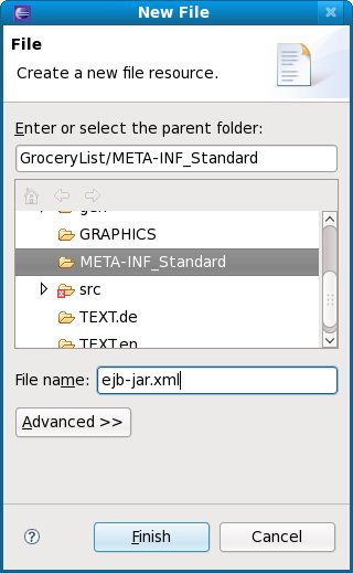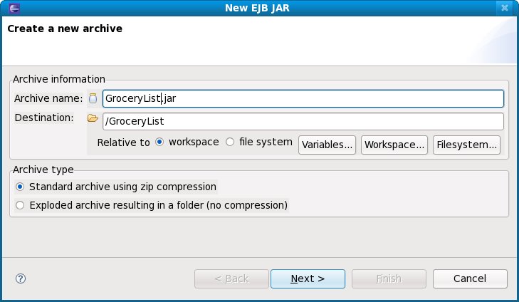 Der vorgegebene 'Archive name' – im Beispiel 'GroceryList.jar'; dieser wird aber bei Ihrem Project sicher anders lauten – existiert bereits für das JAR mit den Klassen des EJB. Deswegen wird der Name der Datei wird um den Zusatz -client erweitert. Anschließend wird die Eingabe des Dateinamens durch Anklicken der Schaltfläche [ Finish ] bestätigt. |