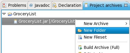 Innerhalb des Bereichs 'Project archives' wird das Project mit der rechten Maustaste angeklickt und aus dem Kontext-Menu New Archive > JAR ausgewählt. |