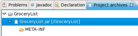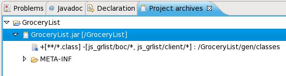 Im Bereich des 'Project archives' ist dann sichtbar, welcher Filter für die Java-Klassen, die in die Archiv-Datei aufgenommen werden, wirksam ist. Die Struktur für die JAR-Datei kann durch Anklicken des kleinen Dreiecks links neben den Datei- bzw. Verzeichnis-Namen angezeigt oder verborgen werden. |