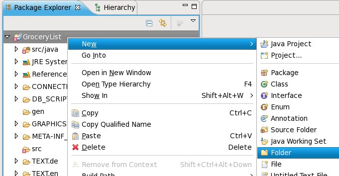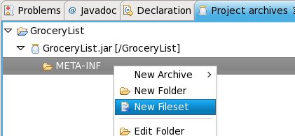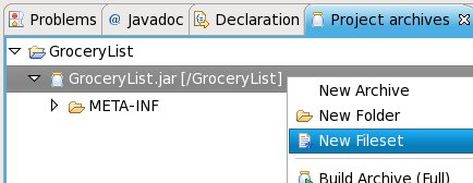 In die Datei werden nur Dateien mit Java-Klassen, die von Client-Programmen importiert werden müssen, aufgenommen. Für das Hinzufügen dieser Dateien wird die gerade angelegte Datei mit der rechten Maustaste angeklickt und aus dem Kontext-Menu New Fileset ausgewählt. |