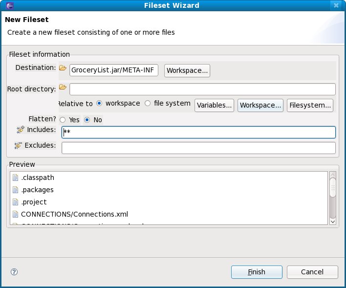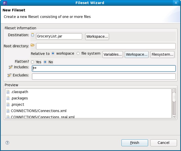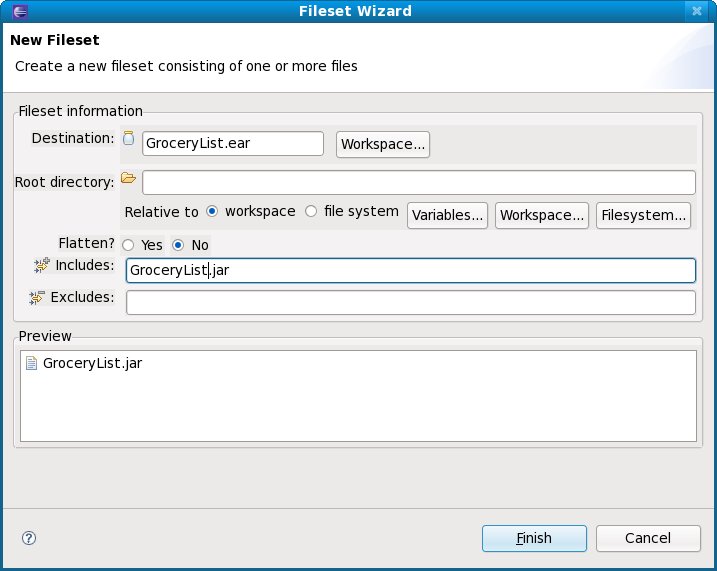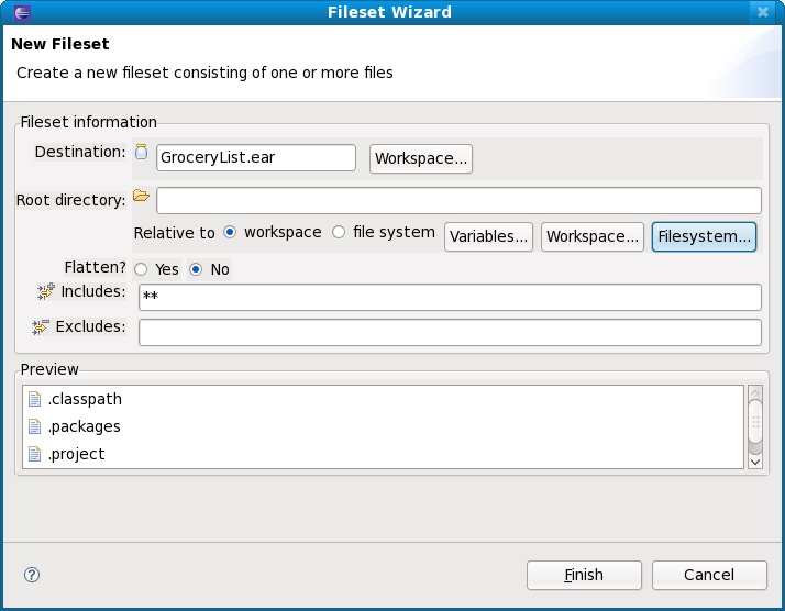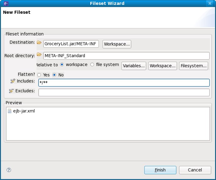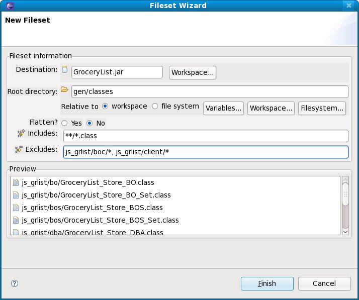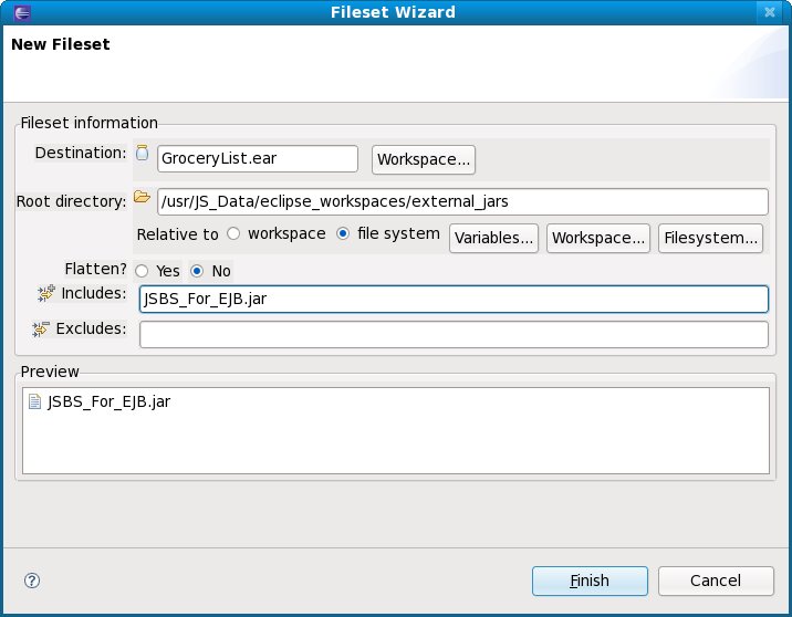 Im Fenster 'Fileset Wizard' wird dann die Datei als Filterkriterium im Feld 'Includes' festgelegt: JSBS_For_EJB.jar. Nach Eingabe der Filter-Kriterien ist im Feld 'Preview' zu sehen, welche Datei ausgewählt ist. Die Definition wird durch Anklicken der Schaltfläche [ Finish ] abgeschlossen und damit wird auch das Fenster geschlossen. |
