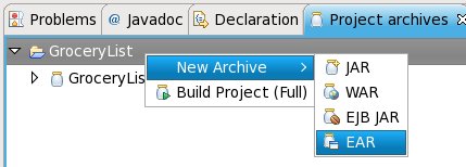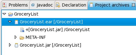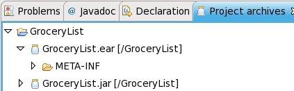 Im Bereich des 'Project archives' ist dann sichtbar, welche Dateien für das packen in die EAR-Datei ausgewählt sind. Die Struktur für die JAR-Datei kann durch Anklicken des kleinen Dreiecks links neben den Datei- bzw. Verzeichnis-Namen angezeigt oder verborgen werden. |