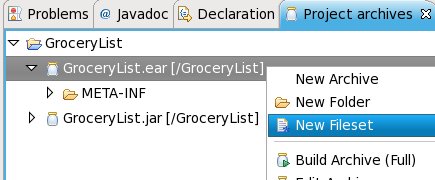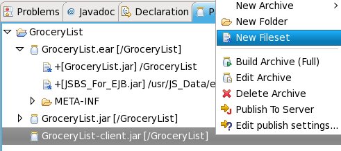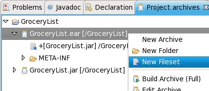 Als Nächstes werden die JAR- (Java ARchiv-) Dateien, die in die EAR- (Enterprise ARchiv-) Datei gepackt werden, festgelegt. Für das Hinzufügen von Dateien wird die Packaging Configuration für das EAR mit der rechten Maustaste angeklickt und aus dem Kontext-Menu New Fileset ausgewählt. |