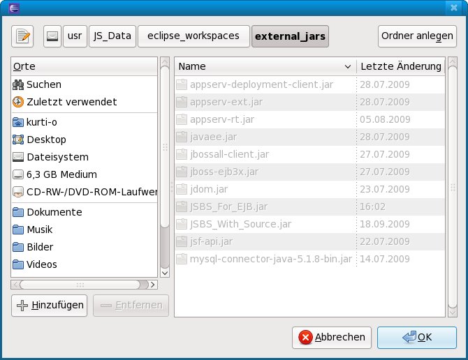 Im erscheinenden Auswahl-Fenster wird zu jenem Verzeichnis manövriert, in dem die JAR-Dateien mit den JavaScout Basisklassen nach dem herunter laden gespeichert wurde. In der Abbildung ist das '/usr/JS_Data_eclipse_workspaces/external_jars' – bei Ihrer Installation wird das aber sicher ein anderes Verzeichnis sein ! Die Auswahl wird durch Anklicken der Schaltfläche [ OK ] bestätigt und damit wird auch das Fenster geschlossen. |