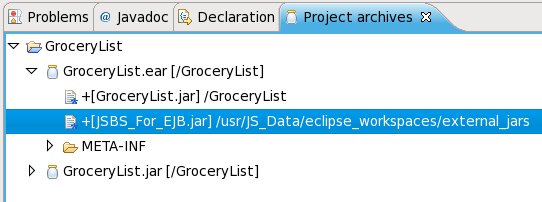 Im Bereich des 'Project archives' ist dann sichtbar, dass auch die JAR-Datei mit den JavaScout Basisklassen in das EAR aufgenommen wird. Die Struktur für die JAR-Datei kann durch Anklicken des kleinen Dreiecks links neben den Datei- bzw. Verzeichnis-Namen angezeigt oder verborgen werden. |