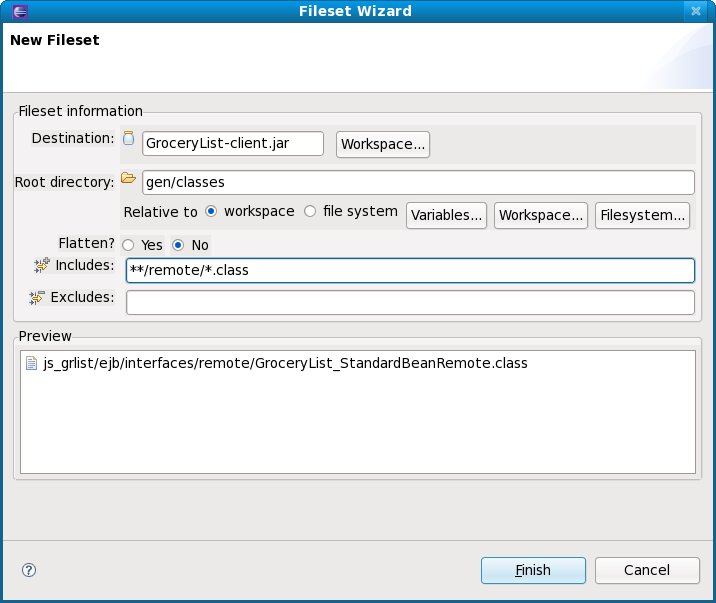 Im Fenster für das 'New Fileset' werden dann noch im Feld 'Includes' die Filterkriterien **/remote/*.class für die Auswahl der Dateien festgelegt. Die ausgewählte Datei (Interface für das EJB – oder auch mehrere EJB) ist dann im Bereich 'Preview' gelistet. Die Auswahl wird durch Anklicken der Schaltfläche [ Finish ] bestätigt und damit wird auch das Fenster geschlossen. |