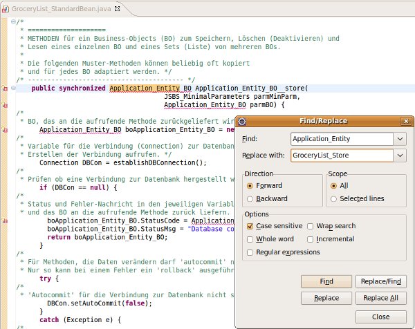 Muster-Code für die Server-Seitige BO-Klasse; diese Klassen werden im EJB aufgerufen und führen die SQL-Operationen für genau einen Datensatz (Speichern oder Lesen mit Kriterien, die maximal einen Datensatz auswählen können) auf die Datenbank durch. |