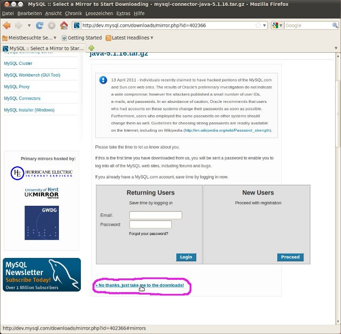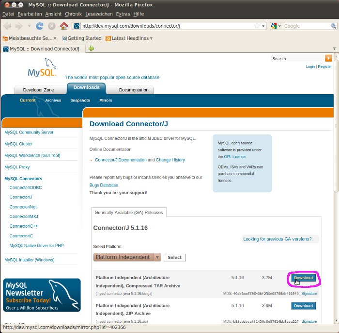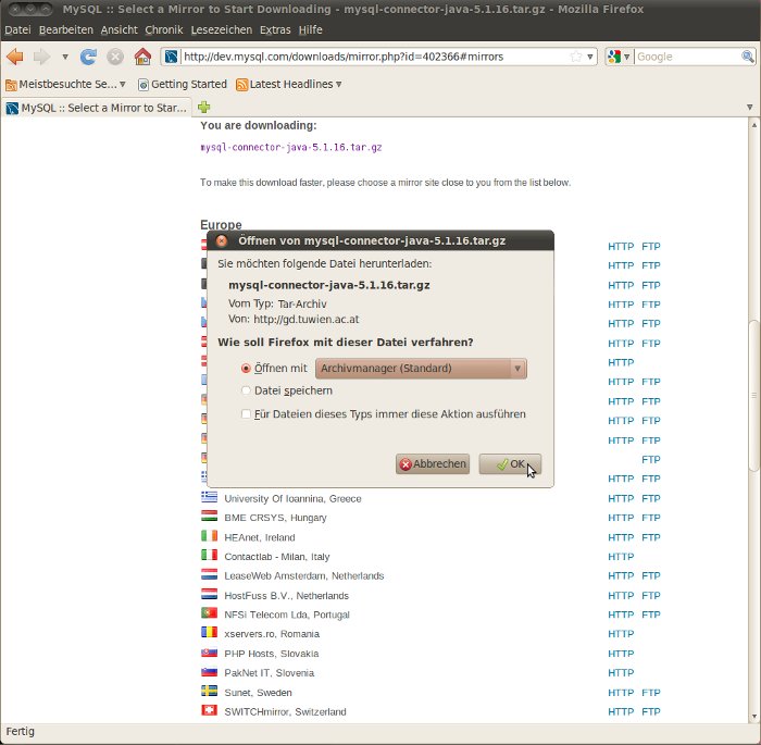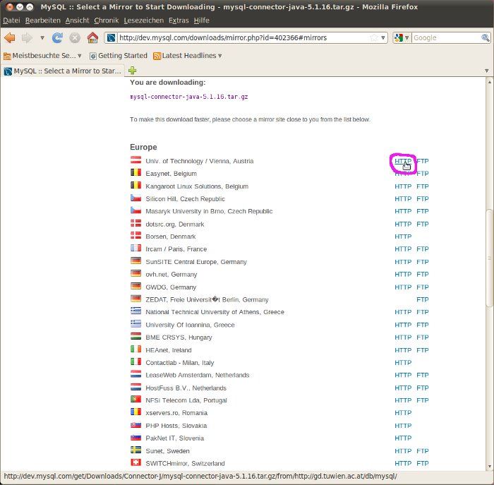 Dieser Schritt gilt nur bei Verwendung eines MySQL-Datenbanksystems. Sie sehen eine Liste mit den Servern, von denen die Bibliothek-Datei für die Verbindung zum MySQL-Datenbanksystem bereit gestellt wird. Wählen Sie