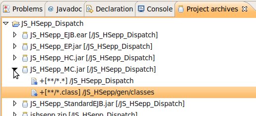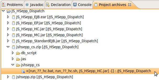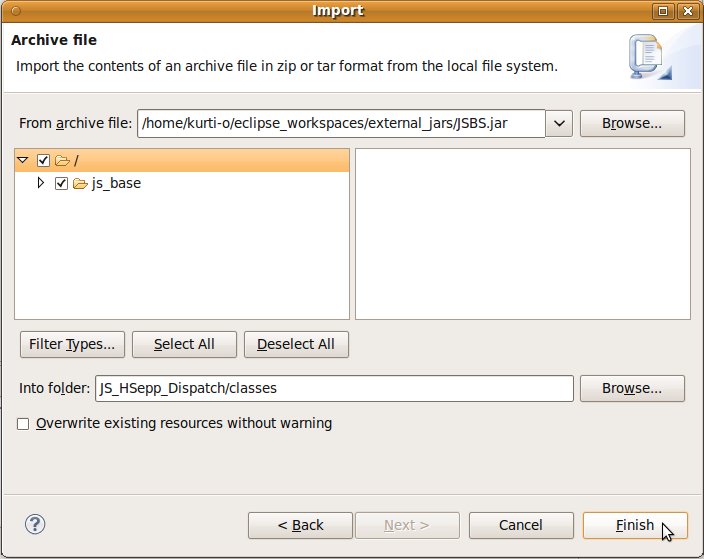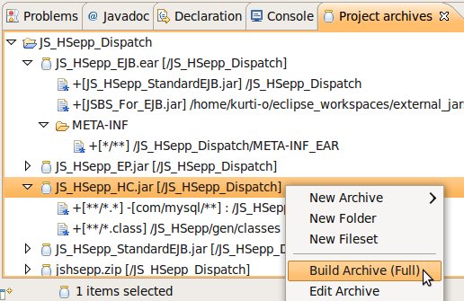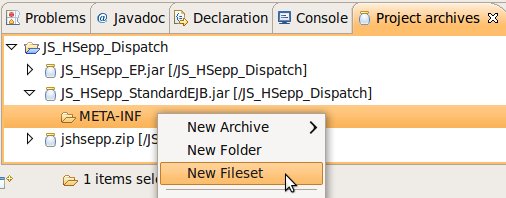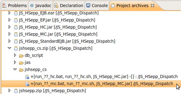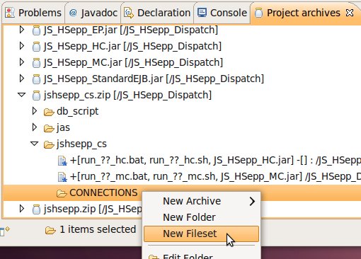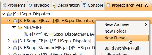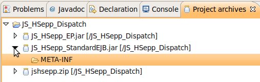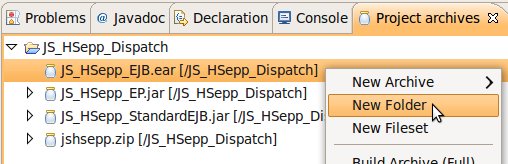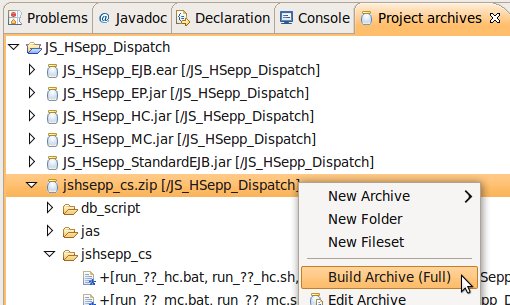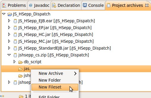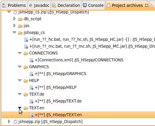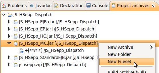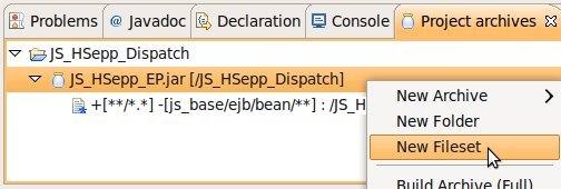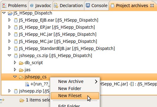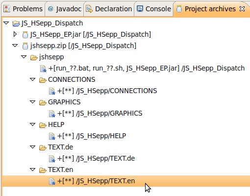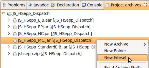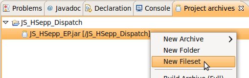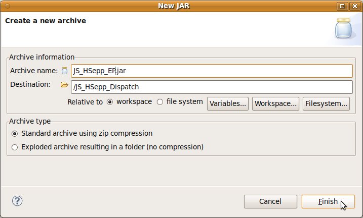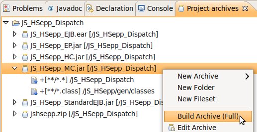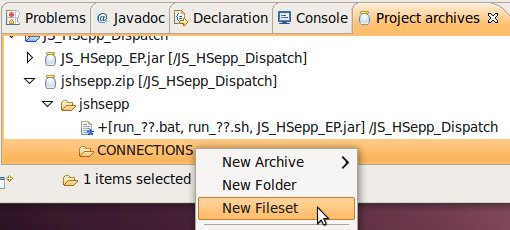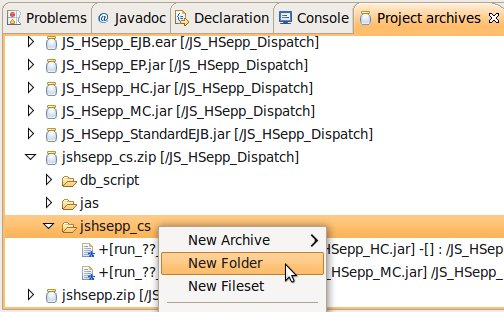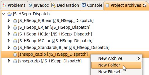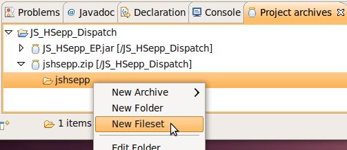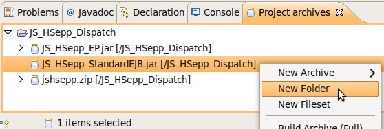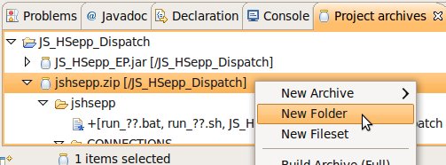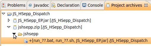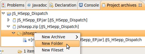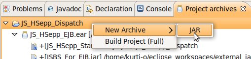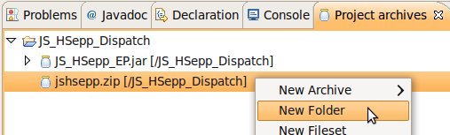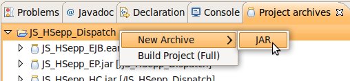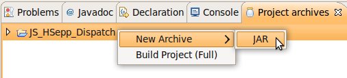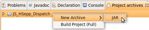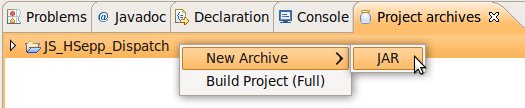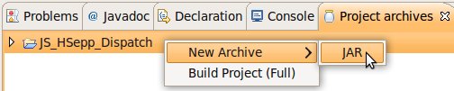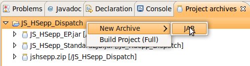 Wählen Sie das Project (im Beispiel: 'JS_HSepp_Dispatch') mit der linken Maustaste aus. Im Bereich 'Project archives' klicken Sie den Eintrag für das Project mit der rechten Maustaste an und wählen Sie aus dem Kontext-Menu New Archive > JAR aus. |