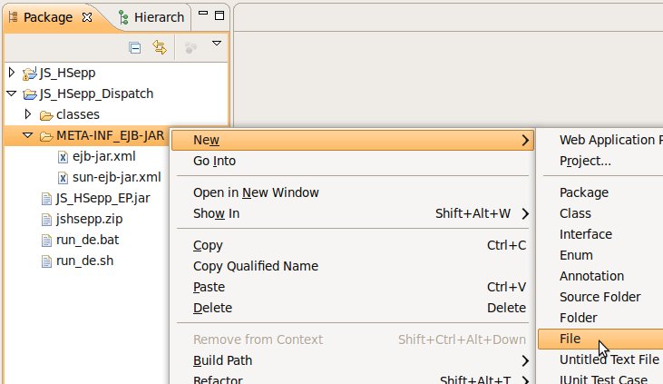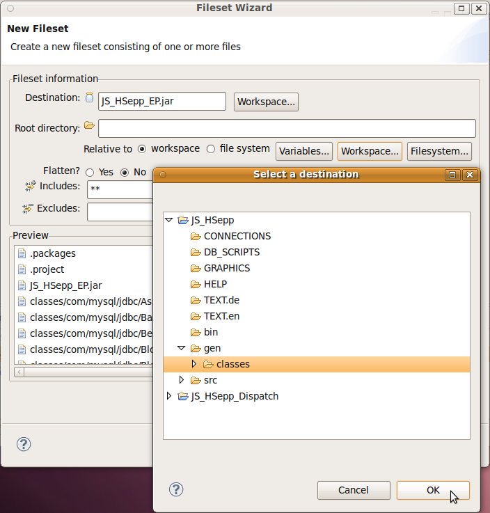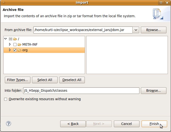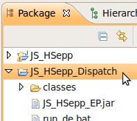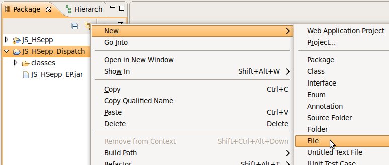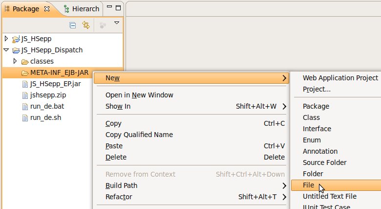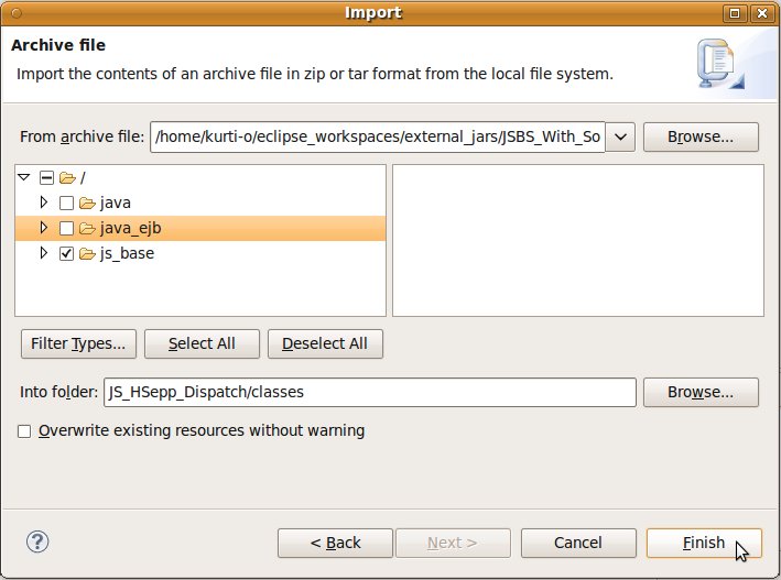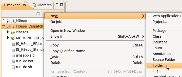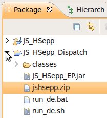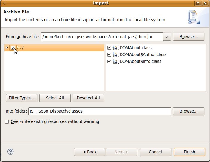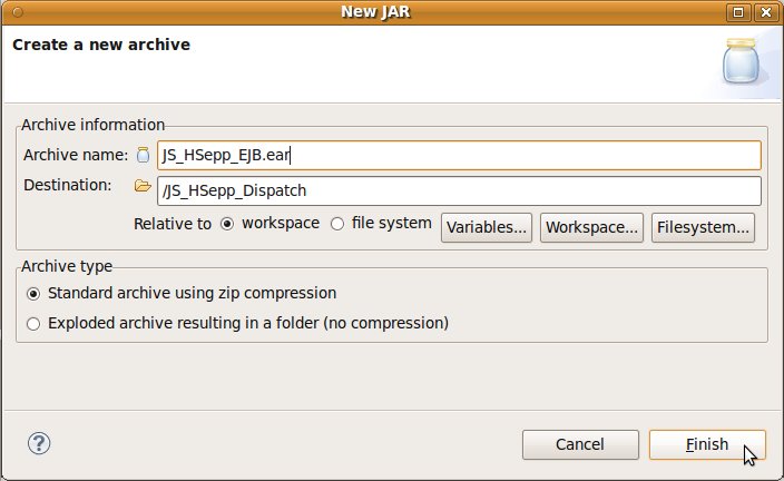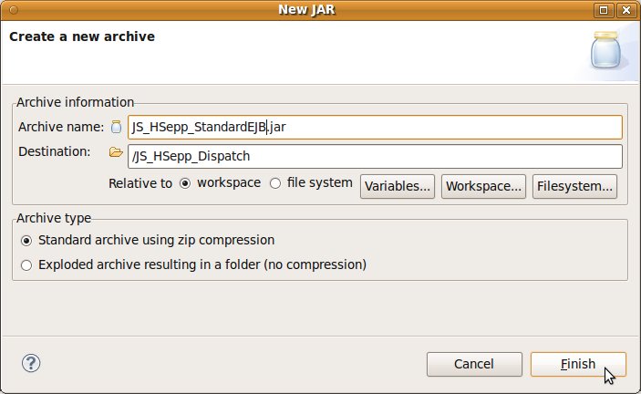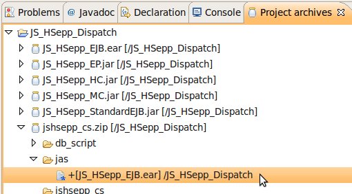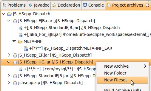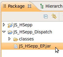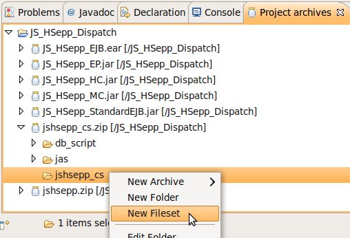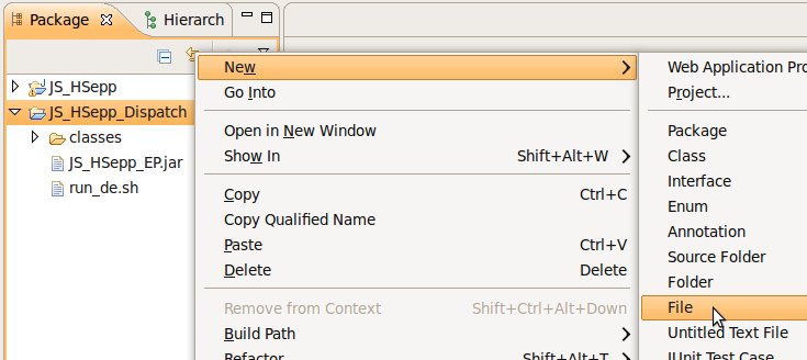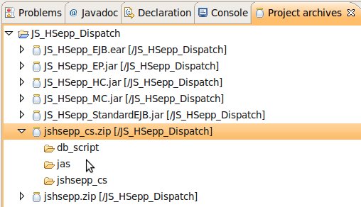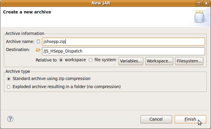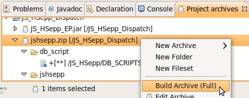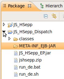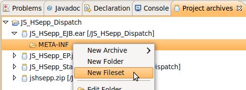 Wählen Sie das Project (im Beispiel: 'JS_HSepp_Dispatch') mit der linken Maustaste aus. Im Bereich 'Project archives' klicken Sie den Eintrag für das Project mit der rechten Maustaste an und wählen Sie aus dem Kontext-Menu New Archive > JAR aus. |