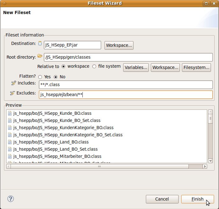 In den folgenden Schritten wird definiert, dass die EAR-Datei mit dem Server-Teil des Anwendungsprogramm und den Basisklassen in das dafür vorgesehene Unterverzeichnis der ZIP-Datei gepackt werden soll.