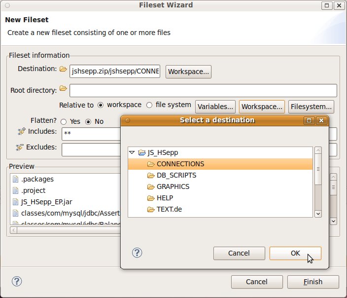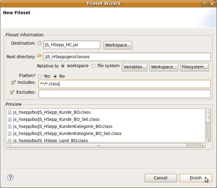 In den folgenden Schritten wird definiert, dass die JAR-Datei mit dem 'Heavxweight-Client' des Anwendungsprogramms und den Basisklassen und die Script-Dateien für den Aufruf des Programms in die ZIP-Datei gepackt werden sollen.
