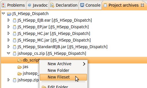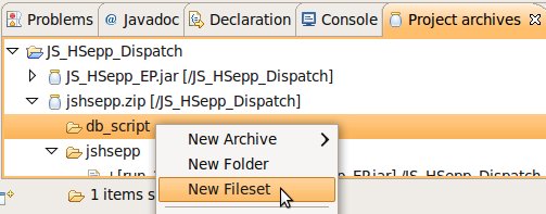 Im Bereich der 'Project archives' klicken Sie bitte den Eintrag für den (im Abschnitt Unterverzeichnis innerhalb des 'Project archive' anlegen erstellten) Ordner 'db_script' mit der rechten Maustaste an und wählen Sie aus dem Kontext-Menu New Fileset aus. |