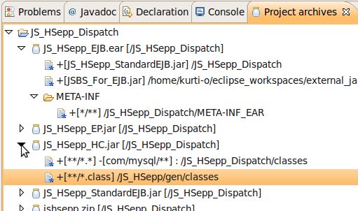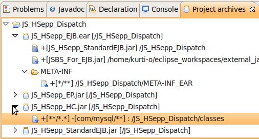 Im Bereich des 'Project archives' ist dann sichtbar, welche Dateien für das Packen in die EAR-Datei ausgewählt sind. Die Struktur für die ZIP-Datei kann durch Anklicken des kleinen Dreiecks links neben den Datei- bzw. Verzeichnis-Namen angezeigt oder verborgen werden. |