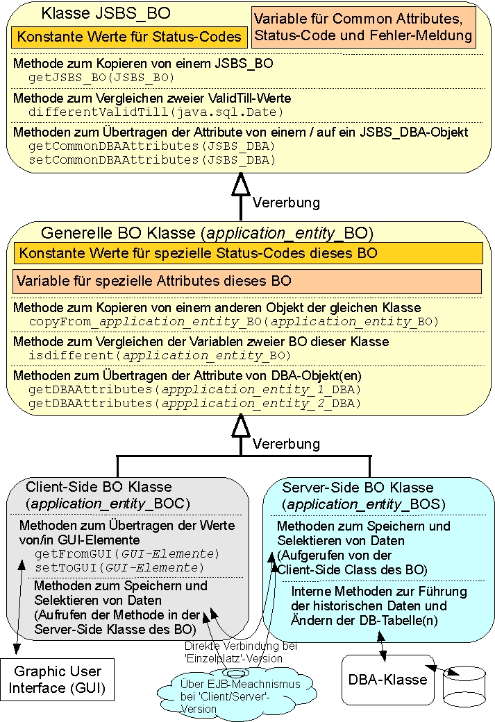 Die Grafik zeigt in stark vereinfachter Form, welche spezialisierter Klasse des BO die Variablen und die notwendigen Methoden implementiert sind.