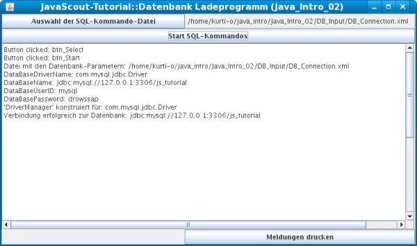 Im nächsten Schritt des Tutorials wird die Verbindung zum Datenbanksystem hergestellt, die SQL-Kommandos aus der gewählten Datei gelesen und die SQL-Kommandos ausgeführt. |