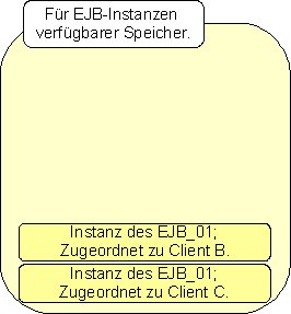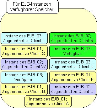 Die obigen Schemata zeigen nur die Speicherbelegung bei einer EJB-Klasse. Im realen Betrieb mit mehr EJB-Klassen und einer Vielzahl von Clients wird der zur Verfügung stehende Speicher wesentlich mehr Instanzen verschiedener EJB-Klassen enthalten. Aufgabe des JAS ist, seit längerer Zeit nicht mehr verwendete Instanzen zu entfernen und damit Speicherplatz freizugeben. |