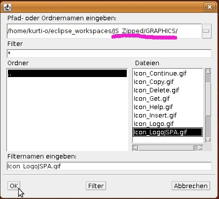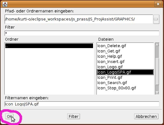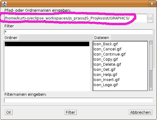 Selbstverständlich kann auch ein anderes als das vorgeschlagene Verzeichnis ausgewählt werden – in diesem Fall wird nicht nur der Name der Datei sondern das gesamte ausgewählte Verzeichnis in das Eingabefeld Name der Datei (ohne Verzeichnis-Teil) mit der Grafik für das Icon in der Title-Bar übernommen.