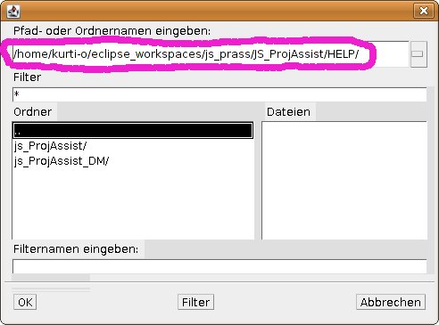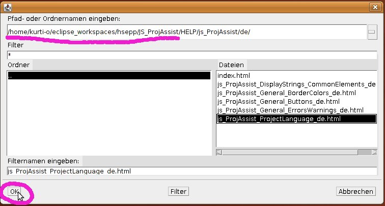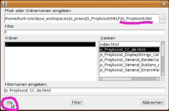 Selbstverständlich kann auch ein anderes als das vorgeschlagene Verzeichnis ausgewählt werden – in diesem Fall wird nicht nur der Name der Datei (und der notwendige Teil des Unterverzeichnisses) sondern das gesamte ausgewählte Verzeichnis in das Eingabefeld Name der Datei (mit Teil-Verzeichnis) mit dem Hilfe-Dokument übernommen.