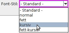 In diesem Auswahl-Feld kann der Schriftstil (normal, fett, kursiv) für das einzelne GUI-Element festgelegt werden oder die im Teilprogramm Layout-Eigenschaften der GUI verwalten definierte, für das gesamte Anwendungsprogramm gültige, Auswahl übernommen werden.