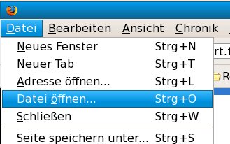 Rufen Sie den Web-Browser (in diesem Beispiel 'Firefox') auf und wählen Sie Datei > Datei öffnen aus.