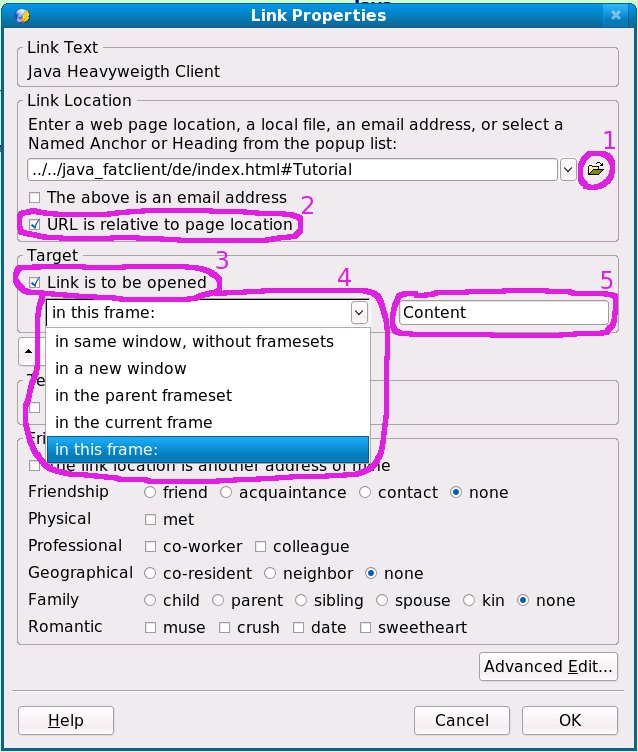 Wenn KompoZer nicht installiert ist und Sie nur selten die Anforderung erfüllen müssen, durch einen 'Link' den Inhalt einer Datei in einem anderen Frame anzuzeigen, kann auch der HTML-Code über einen einfachen Text-Editor verändert werden.